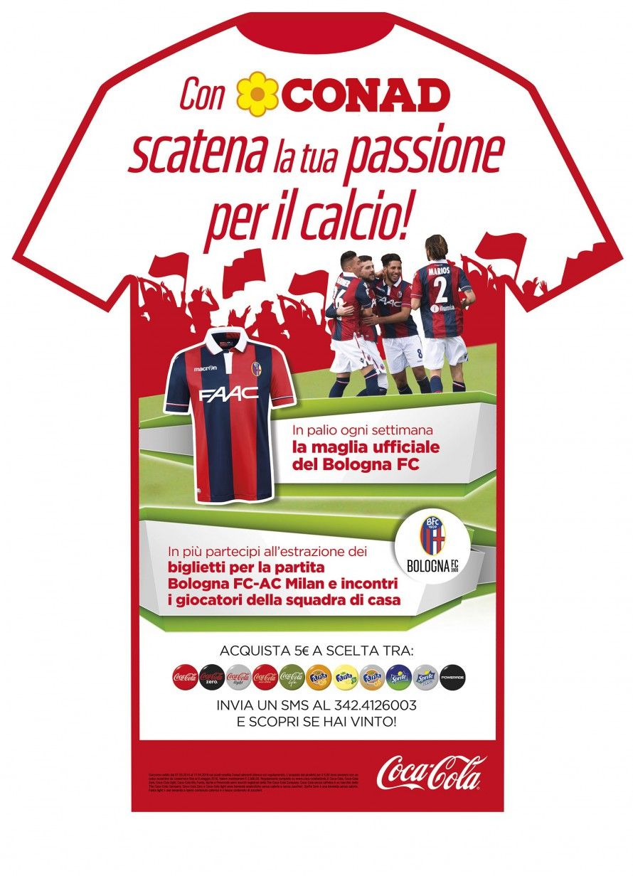 Scatena la tua passione per il calcio con Conad e Coca-Cola, dal 7 Marzo al 17 Aprile acquista 5,00 euro di prodotti a scelta tra Coca-Cola, Fanta, Sprite e Powerade presso un punto vendita Conad di Bologna e provincia, invia un sms con il codice dello scontrino al 342 4126003 e partecipa all’estrazione, ogni settimana in palio una maglia ufficiale del Bologna Fc 1909.